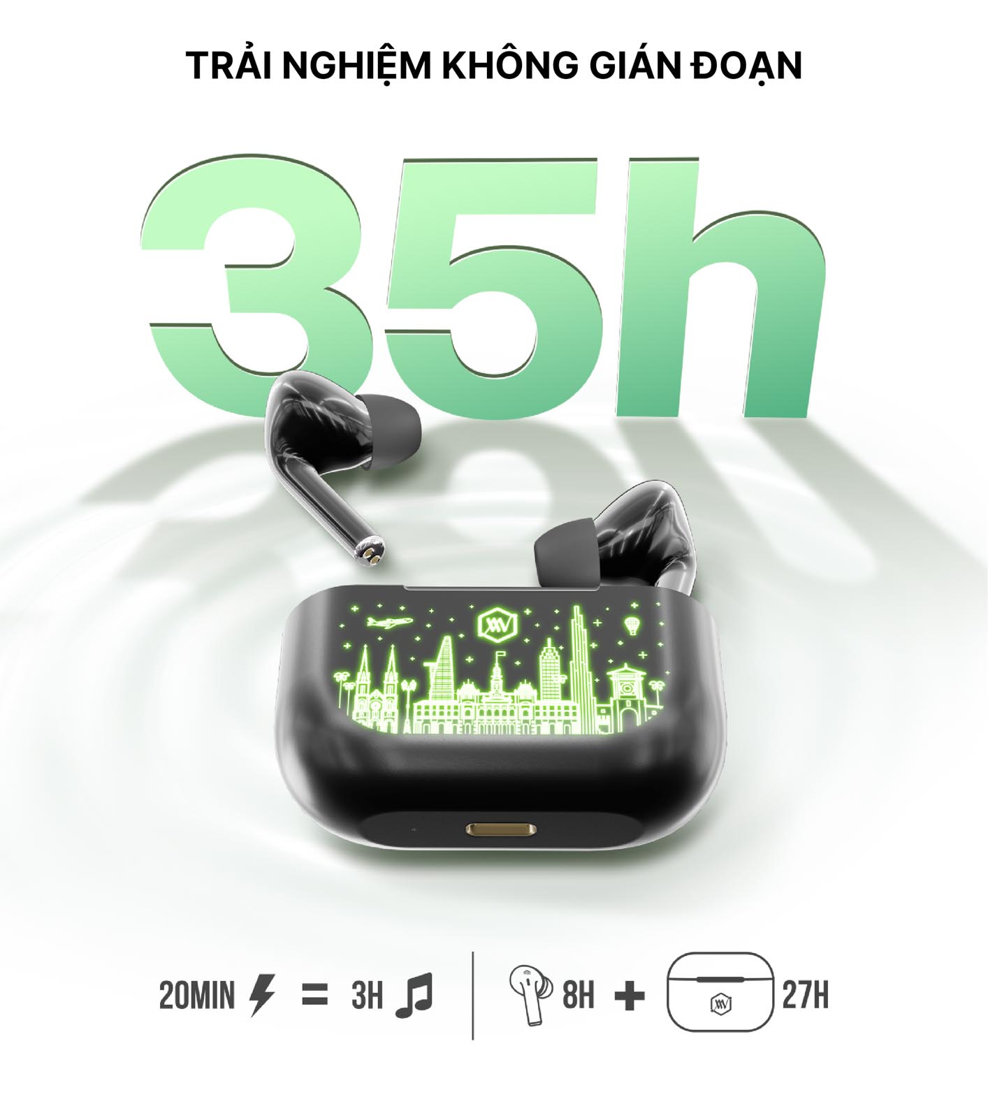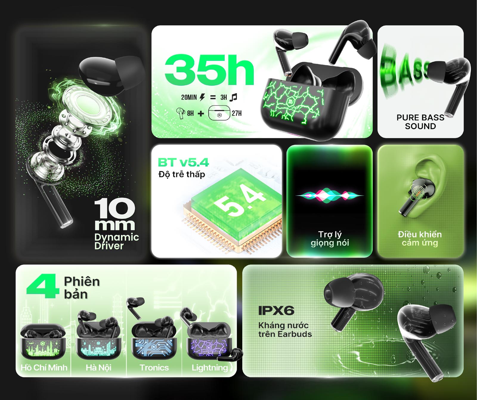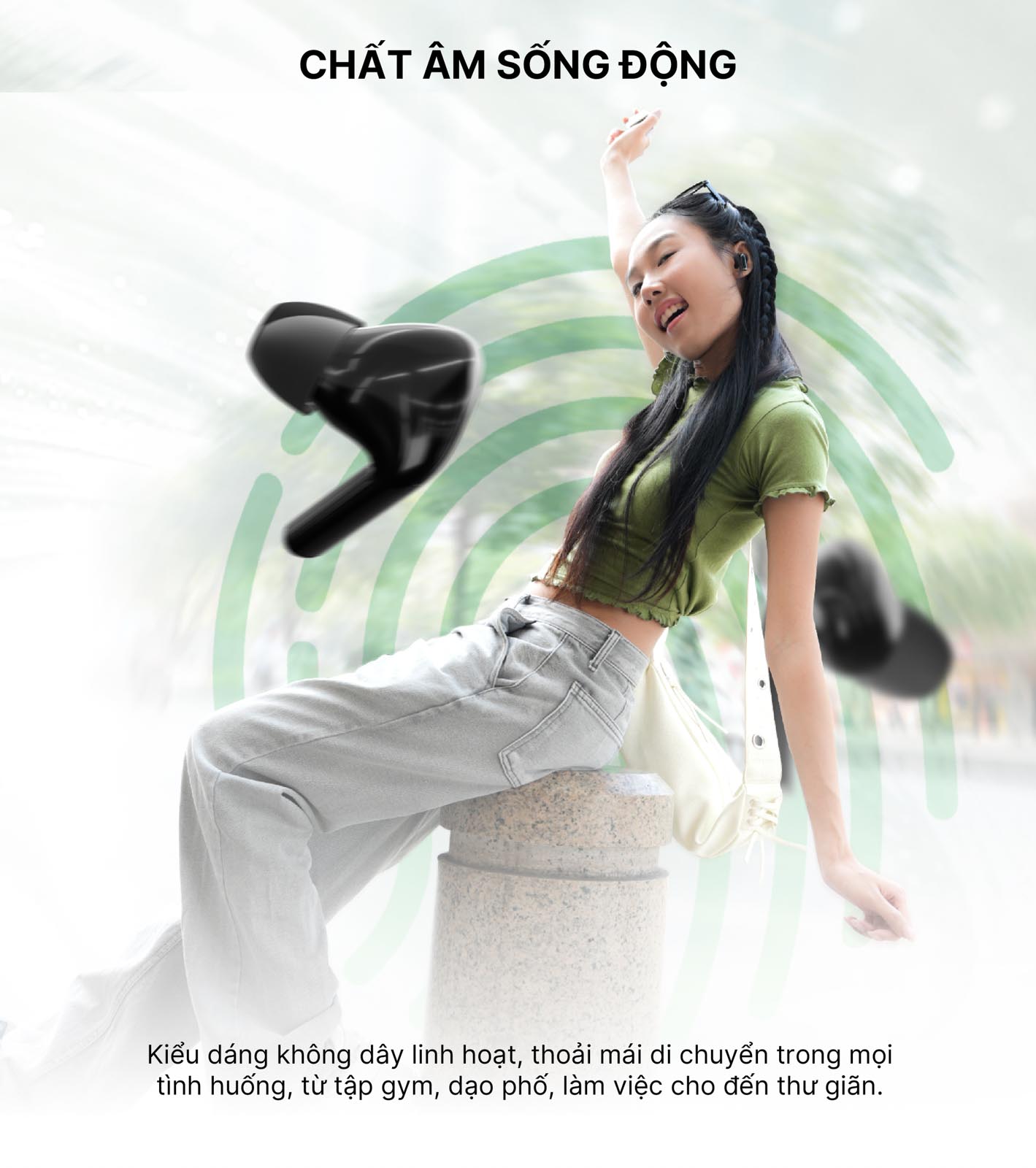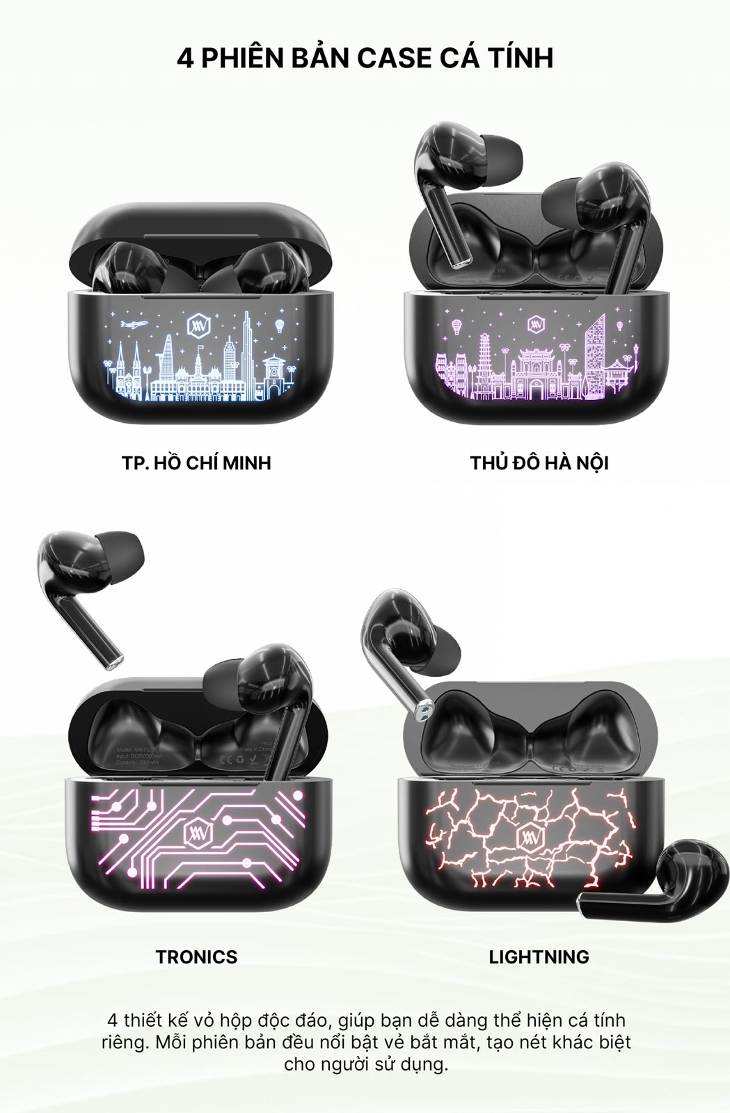 Thưởng thức âm thanh với độ trễ thấp, luôn ổn định trong suốt quá trình sử dụng. Kiểu dáng không dây linh hoạt, thoải mái di chuyển trong mọi tình huống, từ tập gym, dạo phố, làm việc cho đến thư giãn. 4 thiết kế vỏ hộp độc đáo, giúp bạn dễ dàng thể hiện cá tính riêng. Mỗi phiên bản đều nổi bật vẻ bắt mắt, tạo nét khác biệt cho người sử dụng.