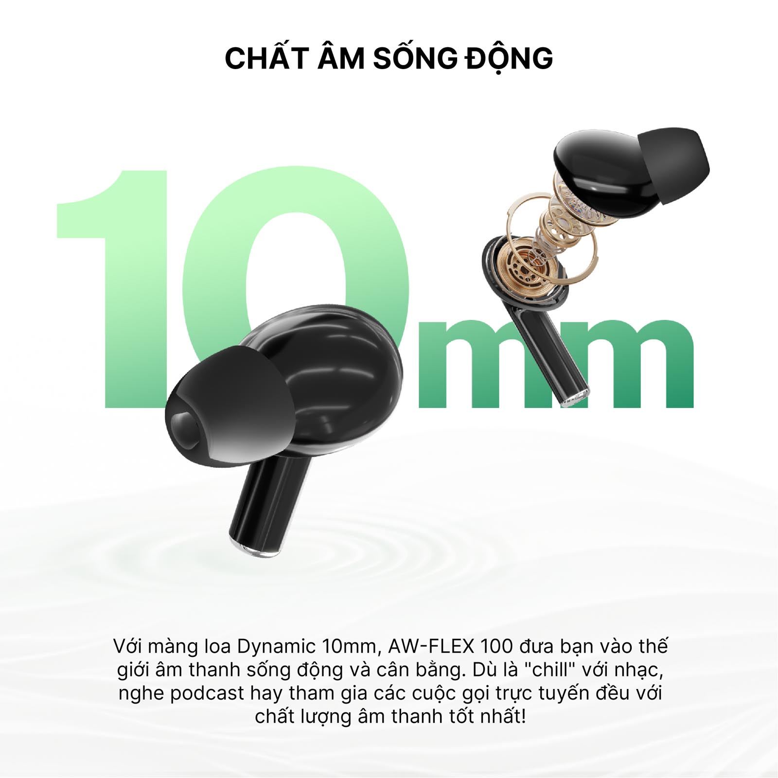 Với màng loa Dynamic 10mm, AW-FLEX 100 đưa bạn vào thế giới âm thanh sống động và cân bằng. Dù là 'chill' với nhạc, nghe podcast hay tham gia các cuộc gọi trực tuyến đều với chất lượng âm thanh tốt nhất! Trang bị Bluetooth 5.4 mới nhất.