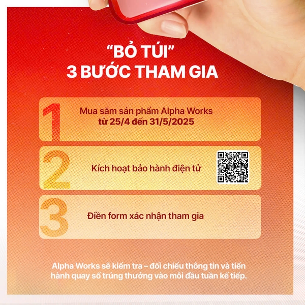 - Mua sản phẩm Alpha Works bất kỳ từ 25/04 đến 31/05/2025 tại toàn bộ hệ thống đại lý phân phối và cửa hàng chính hãng Alpha Works trên toàn quốc.