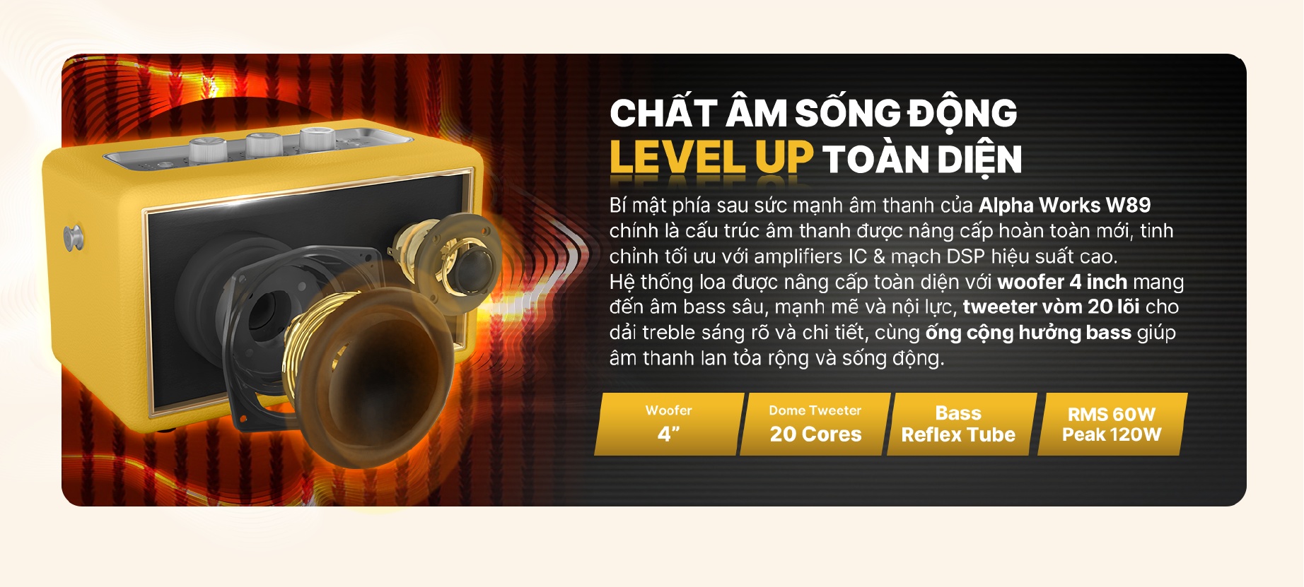Hệ thống loa được nâng cấp toàn diện với woofer 4 inch mang đến âm bass sâu, mạnh mẽ và nội lực, tweeter vòm 20 lõi cho dải treble sáng rõ và chi tiết, cùng ống cộng hưởng bass giúp âm thanh lan tỏa rộng và sống động. Nhờ vậy, loa Alpha Works W89 có thể đạt công suất đỉnh 120W, công suất RMS 60W, đủ mạnh để lấp đầy mọi không gian.