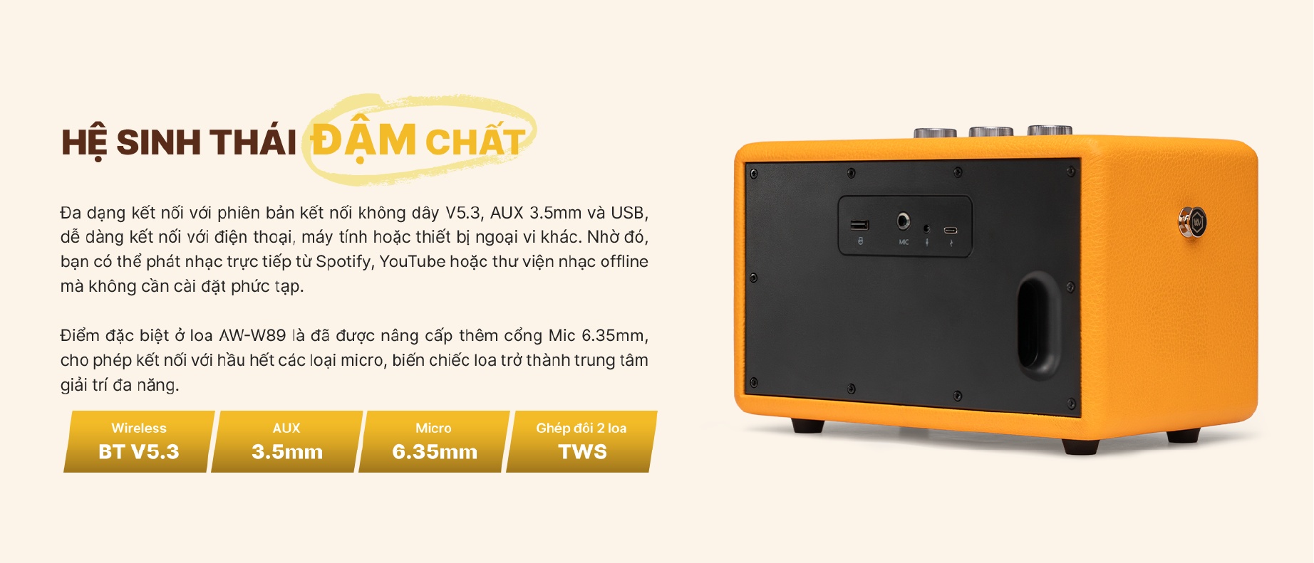 Âm thanh của W89 được tinh chỉnh theo hướng cân bằng: bass xuống sâu nhưng không bị ù, mid rõ ràng, treble sáng – phù hợp với nhiều thể loại từ pop, rap đến EDM. Ngoài ra, cụm núm vặn điều chỉnh bass – treble – volume đặt ngay trên mặt loa mang lại cảm giác điều khiển analog rất “real”, rất đã tay.
