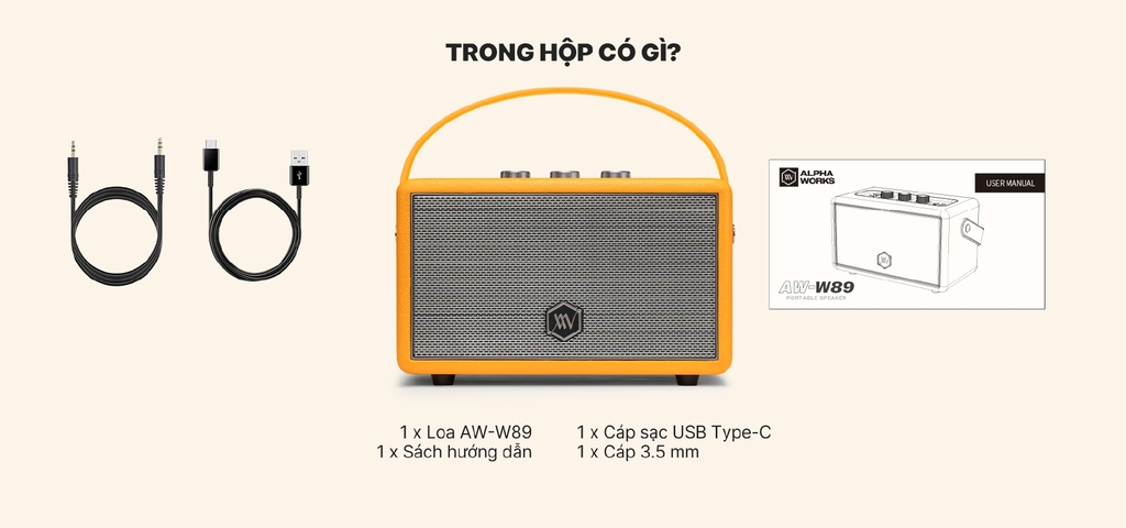 Alpha Works W89 là chiếc loa nâng cấp toàn diện của dòng retro di động Alpha Works, hướng tới những người trẻ yêu âm nhạc, thích phong cách vintage nhưng vẫn cần hiệu năng hiện đại. Không chỉ mạnh mẽ hơn, mang đậm cá tính hơn, loa W89 còn mang đến trải nghiệm nghe nhạc hoàn toàn mới, giữ trọn chất âm nguyên bản Alpha Works Signature Sound nhưng được nâng cấp cả về cấu trúc loa, công suất 60W RMS, thời lượng pin lên đến 28 giờ và khả năng kết nối không dây và có dây đa dạng. W89 không chỉ để nghe – mà còn để chơi, để chill, và để thể hiện cá tính ở bất kỳ không gian nào.